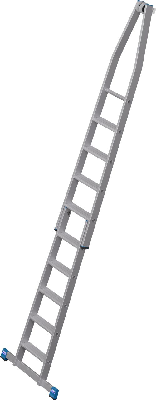 - A létra felső tagja fali vezetőgörgőkkel és kopásálló, puha gumi anyagú érintkező blokkal, ékkivágással, mely házsarkokra és ablakprofilokra helyezhető.